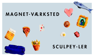 I vinterferien byggede vi huse, så denne gang skal vi lege med det, der er indenfor. Vi inviterer til påskeferieværksted den 28. marts til og med 3. april kl. 13.00–15.30, hvor vi zoomer helt ind og arbejder med modellering i miniature. Vi skal lege med Sculpey-ler og lave vores helt egne, unikke køleskabsmagneter. Hvad mangler dit miniunivers? Kun fantasien sætter grænser, når vi former de små detaljer og forvandler dem til flotte magneter, du kan tage med hjem. Læs mere her.
